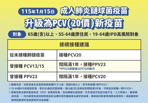 公費適用對象與接種建議(自115年1月15日): - 65歲年長者: 65歲以上長者可接種1劑PCV20(若曾接種過23價疫苗,間隔1年後可打PCV20)。