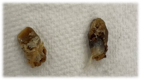 上圖是從一個6歲小孩的耳朵取出的耳屎,大約長度1.3cm,像軟木塞一樣的耳屎塞住小孩的耳朵,病人的主訴是單側的耳朵會疼痛,主要的原因是耳屎吸到水份膨脹造成耳朵壓迫的不適感,另一側是乾燥的比較沒有感覺,這樣的耳屎量都是長年累積,至少3-5年的累積所造成的,尤其是使用棉花棒斷斷續續的將耳屎往內推,慢慢硬化結塊,導致像軟木塞的耳屎塞住耳朵,完全被耳屎塞住的耳朵會影響兒童的聽力及學習,在臨床上並非少見,所以如果遇到小孩聽力有些不正常,應該帶來給醫師檢查,平常不要太常挖耳朵,將耳屎往內塞造成排出困難,形成耳垢栓塞。